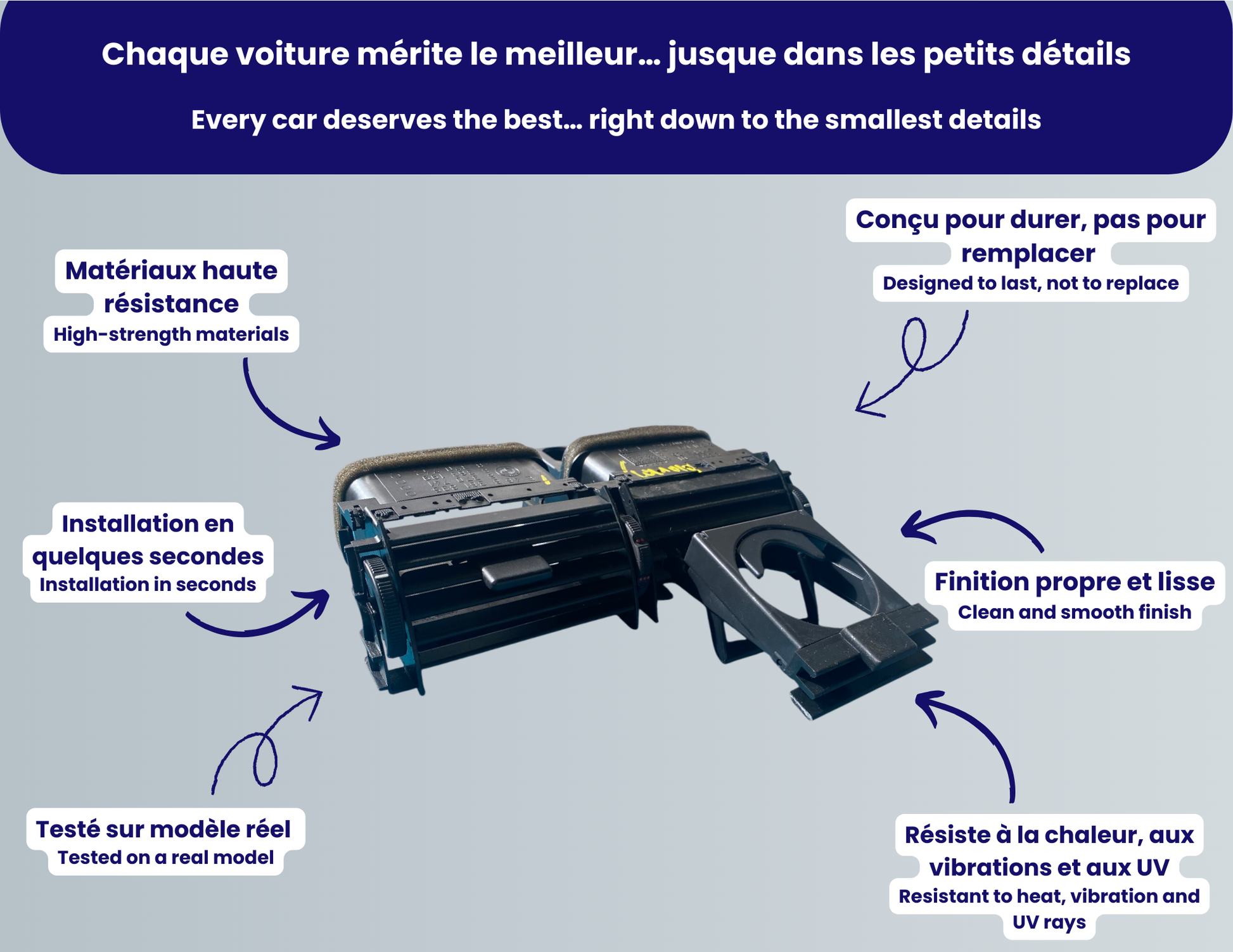 Designed and 3D printed with high precision by AutoPrintLab, it fits directly into the central ventilation module for an OEM+ look, discreet and functional.
