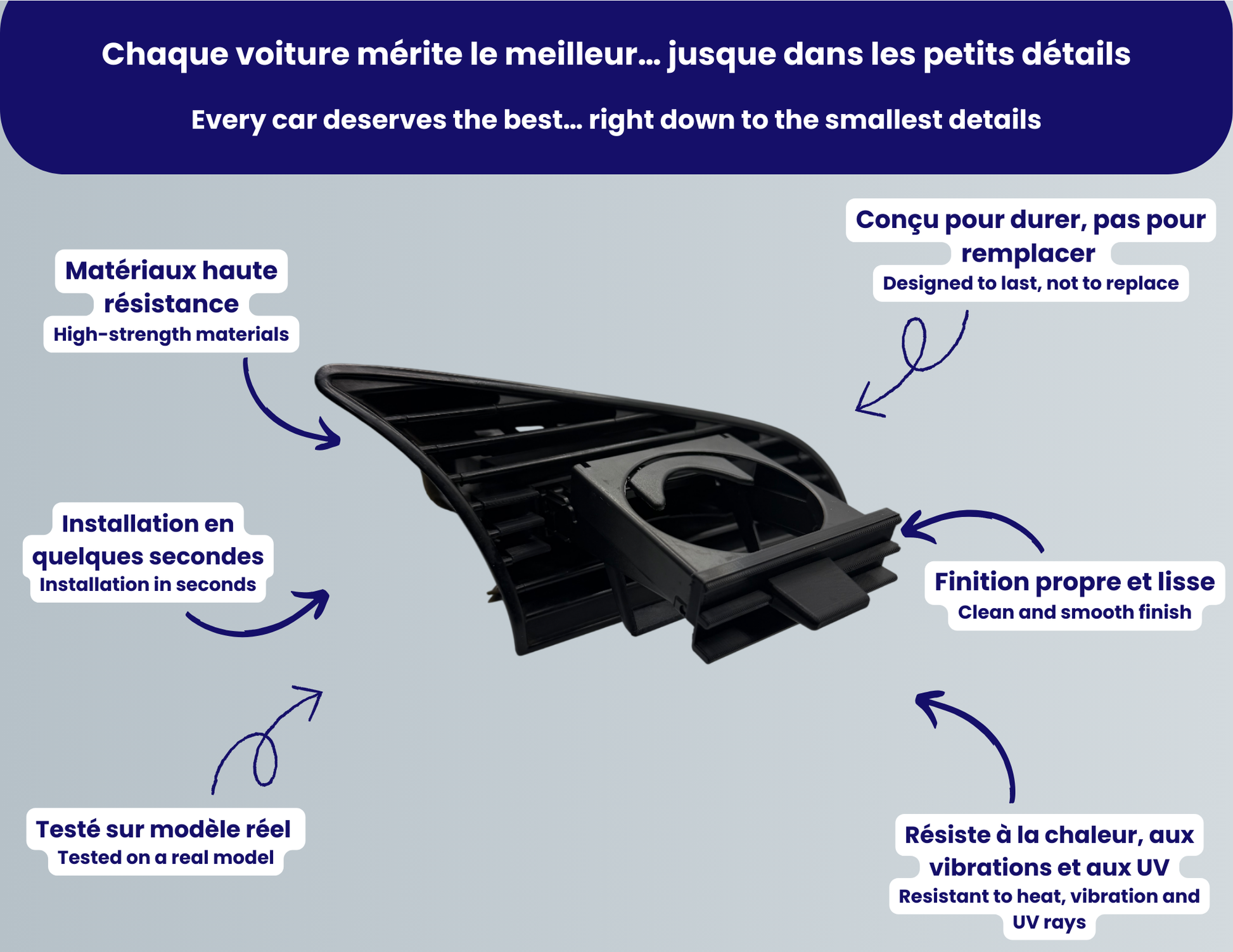La plupart de nos pièces s’installent en moins de 30 secondes grâce à un système d’emboîtement ou de clipsage inspiré des pièces OEM (origine constructeur).
